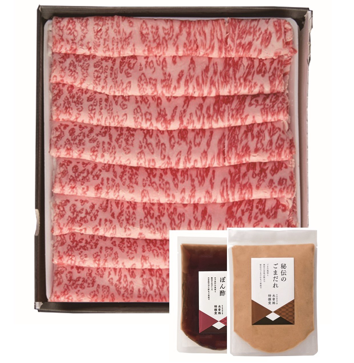 | 内容量 | 黒毛和牛しゃぶしゃぶ用240g,ごまだれ360g,ぽん酢360g |
