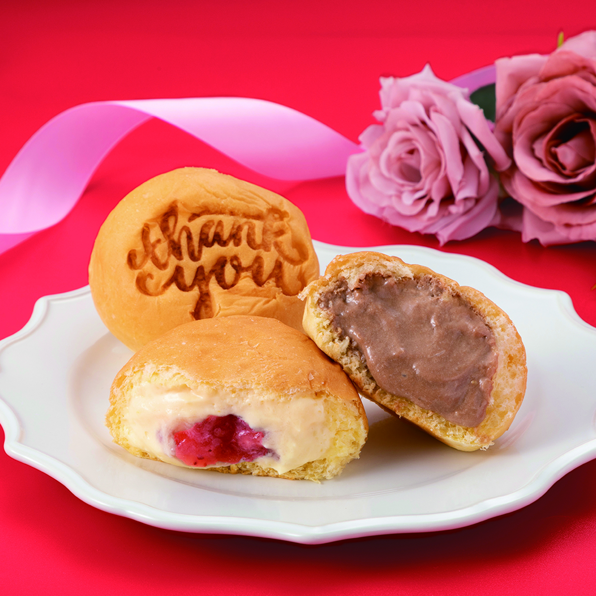 「カスタード」に「thank you」の焼印を施しました。くりーむパンあまおう苺は、軽くてくちどけの良いカスタードクリームと