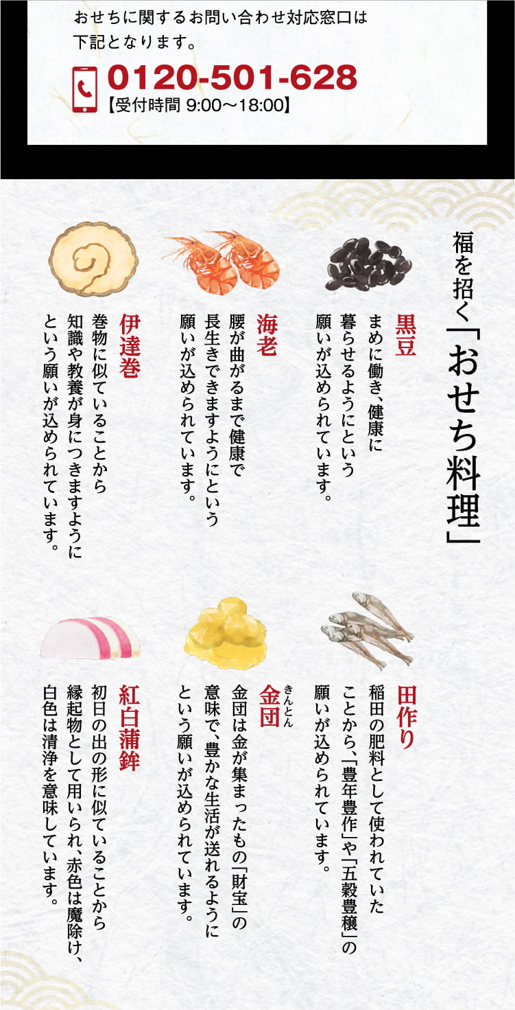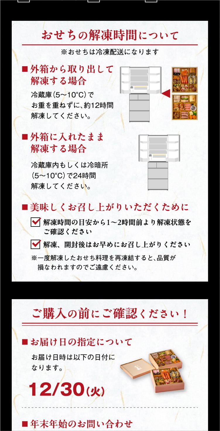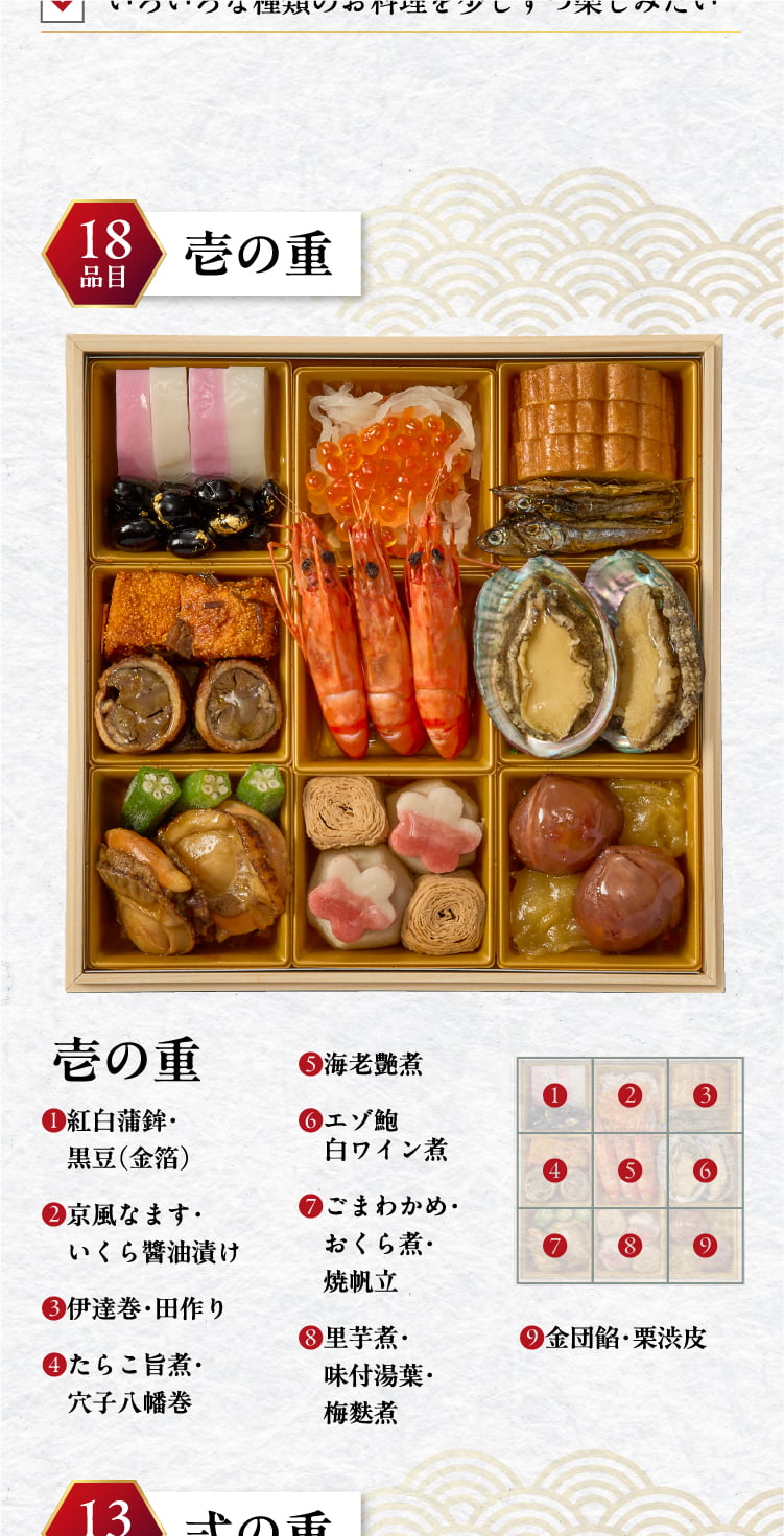 | 原材料 | 【一の重】金団餡[さつまいも加工品、水飴、砂糖、白生あん、寒天](国内製造)、海老艶煮[えび、砂糖、その他]、焼帆立[帆立貝、味醂、醤油、合成清酒、タレ(アミノ酸液、 砂糖、醤油、発酵調味料、りんご酢)]、紅白蒲鉾[魚肉すり身、砂糖、その他]、栗渋皮 [栗、砂糖]、 穴子八幡巻 [穴子、 ごぼう、その他]、 里芋煮 [さといも、砂糖、その他]、 京風なます[大根、金時人参、砂糖、醸造酢、その他]、味付湯葉 [湯葉、砂糖、その他]、 伊達巻 [鶏卵、砂糖、魚肉すり身、その他]、 たらこ旨煮 [マダラ卵、醤油、味醂、砂糖、 その他]、エゾ鮑白ワイン煮 [エゾアワビ、ワイン、日本酒、植物たん白加水分解物、食塩、鰹エキス]、 黒豆 (金箔) [黒大豆、砂糖、還元水飴、発酵調味料、食塩]、ごまわかめ[茎わかめ、醤油、果糖ぶどう糖液糖、その他]、おくら煮[おくら、食塩、鰹風味調味料]、 田作り[カタクチイワシ、砂糖、水飴、醤油、その他]、いくら醤油漬け[鮭卵、調味液(醤油、オリゴ糖、水飴、発酵調味料、食塩、その他)、食塩]、 梅麩煮[生麩、発酵調味料、砂糖、その他] 【二の重】豚肩ロースチャーシュー[豚肉、醤油、砂糖、清酒、味醂、生姜](国内製造)、 鶏三色巻 [鶏肉、鶏皮、 その他]、 牛肉しぐれ[牛肉、砂糖、醤油、その他]、洋風野菜ミッ クス[ブロッコリー、カリフラワー、人参、植物油脂、その他]、かにとクリームソースのパイ包み[パイ生地、 魚肉、乳等を主要原料とする食品、ゆでがに、その他] 、黒毛和牛ローストビーフ赤ワイン漬け[牛肉、果実酒、その他][、紅茶鴨ロース山椒風味[あい鴨肉、醤油、砂糖、味醂、山椒、食塩、醸造酢、紅茶、魚介エキス]、 ローストビーフ[牛肉、食塩、胡椒、砂糖、にんにく、でん粉]、合鴨ももーロスモーク[あい鴨肉、食塩、砂糖、 香辛料]、和風おろしソース[醤油、大根、玉葱、その他]、合鴨燻製スライス[あい鴨肉、食塩、砂糖、香辛料、紅茶]、 ライプオリーブ[ライプオリーブ、食塩]、スタッフドオリーブ [オリーブ、赤ピーマン、食塩] /加工でん粉、糊料(加工でん粉、増粘多糖類、アルギン酸Na)、トレハロース、調味料(アミノ酸等)、ソルビット、pH調整剤、酒精、着色料(カラメル、カロチノイド、コチニール、黄4、青1、赤102)、乳化剤、グリシン、酸味料、保存料(ソルビン酸、ポリリジン)、リン酸塩(Na)、酸化防止剤(V.C)、甘味料(カンゾウ、ステビア)、発色剤(亜硝酸Na)、香料、塩化Ca、リン酸Ca |